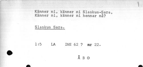 //// ! //// Känner ni, känner ni Slaskus-Sara, //// Känner ni, känner ni hennar nå? //// . //// Slaskus Sara. //// 1:5 LA INE 62 ? mr 22. //// ^ ÅBO ////