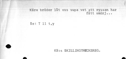 //// - ** //// Käre bröder låt oss supa vet att ryssen har //// fått smörj... //// Se: I 11 t,y //// ^ KR:s SKILLINGTRECKSREG. //// i* * ////