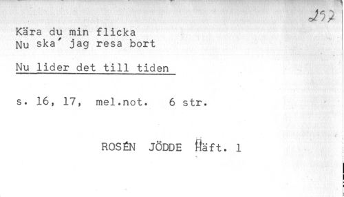 //// J5 //// /Kära du min flicka //// Nu ska' jag resa bort //// ' * * * //// Nu lider det till tiden //// —————_.____ //// ! //// s. 16, 17, mel.not. 6 str. //// ROSÉN JÖDDE ^äft. 1 //// ^ ! //// < //// ) ////