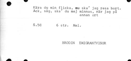 //// Kära du min flicka, mu ska' jag resa bort. //// Ack, säg, ska' du mej minnas, när jag på //// annan ort //// S.58 6 str. Mel. //// 4 //// BRODIN EMIGRANTVISOR ////