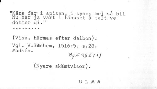 //// "Kära far i spisen, i synes mej så bli //// Nu har ja vart i fähuset a tält ve //// dotter di." //// (Visa, härmas efter dalbon). //// Vgl.^V.^&nhem, 1516:5, s.28. //// Madsén. //// (Nyare skämtvisor). //// U L M A ////