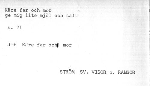 //// Kära far och mor //// ge mig lite mjöl och salt //// s. 71 //// ^ //// ! //// t //// Jmf Käre far ochf mor //// i //// f //// * //// STRÖM SV. VISOR o. RAMSOR //// : ////