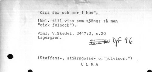 //// * ' //// . //// "Kära far och mor i hus". //// (Mel. till visa som sjöngs så man //// "gick julbock"). //// Vrml. V.Skedvi, 2447:2, s.20 //// Lagergren. ^ ^ //// ^ (Staffans-, stjärngosse- o."julvisor.") //// U L M A //// * ////