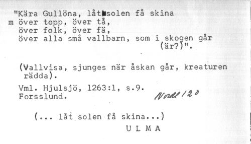 //// "Kära Gullöna, låt*solen få skina //// m över topp, över tå, //// över folk, över fä, //// över alla små vallbarn, som i skoqen går //// (är?)". //// (Vallvisa, sjunges när åskan går, kreaturen //// rädda). //// Vml. Hjulsjö, 1263:1, s.9. //// Forsslund. //// i //// (... låt solen få skina...) //// U L M A //// ; ////