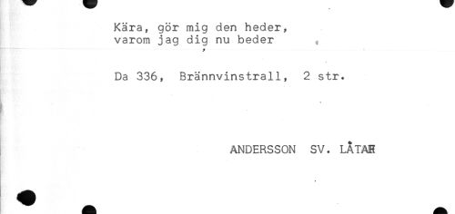 //// Kära, gör mig den heder, //// varom jag dig nu beder < //// * //// Da 336, Brännvinstrall, 2 str. //// ' -- //// f //// - //// ANDERSSON SV. LATAH ////