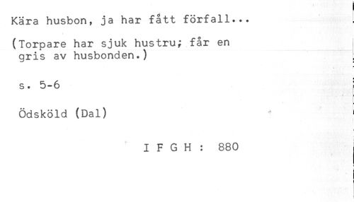 //// Kära husbon, ja har fått förfall... //// (Torpare har sjuk hustru; får en //// gris av husbonden.) //// a //// g //// s. 5-6 //// Ödsköld (Dal) //// I F G H : 880 //// e ////