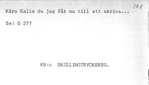 //// Kära Kalle du jag far nu till att skriva... //// Se: G 277 //// i //// KB:s SKILLINGTRYCKSREG. //// t //// i ////