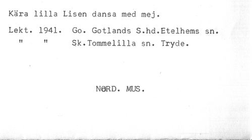//// Kära lilla Lisen dansa med mej. //// Lekt. 1941. Go. Gotlands S.hd.Etelhems sn. //// " " Sk.Tommelilla sn. Tryde. //// NORD. ms. ////