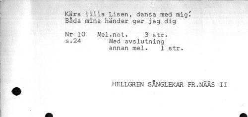 //// Kära lilla Lisen, dansa med mig^ //// Båda mina händer ger jag dig //// Nr 10 Mel.not. 3 str. //// s.24 Med avslutning //// annan mel. 1 str. //// ! //// ! //// t //// ! ; , //// ^ HELLGREN SÅNGLEKAR FR.NÄÄS II //// ! iittth ////