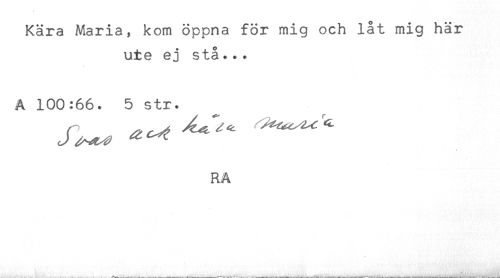 //// Kära Maria, kom öppna för mig och låt mig här //// ute ej stå... //// A 100:66. 5 str. //// RA ////
