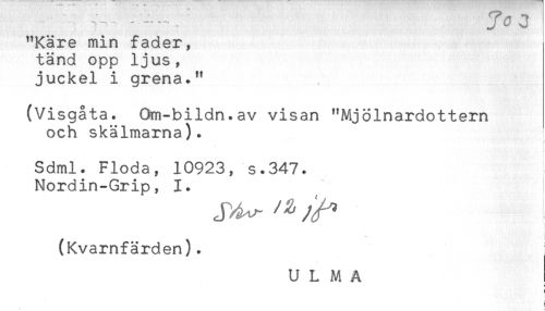 //// "Käre min fader, //// tänd opp ljus, //// juckel i grena." //// (Visgåta. Om-bildn.av visan "Mjölnardottern //// och skälmarna). //// Sdml. Flöda, 10923, s.347. //// Nordin-Grip, 1. //// t //// t //// < //// (Kvarnfärden). //// U L M A //// i //// * ////