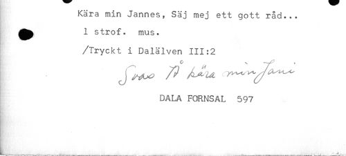 //// Kära min Jannes, Säj mej ett gott råd... //// i //// ^^ 1 strof. mus. //// /Tryckt i Dalälven 111:2 //// DALA FORMSAL 597 //// L____ . . ////