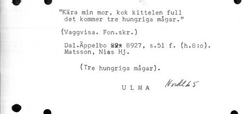 //// "Kära min mor, kok kittelen full //// det kommer tre hungriga magar." //// . — .———... -—.———-————.— ——- //// (Vaggvisa. Fon.skr.) //// Dal.Äppelbo 88* 8927, s.51 f. (h.8:o). //// Matsson, Nias Hj. //// (Tre hungriga magar). //// U L M A ^^ ////