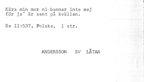 //// Kära min mor ni bannar inte mej //// för ja' är sent på kvällen. //// - //// < //// Se 11:537, Polska, 1 str. //// : //// ANDERSSON SV LATAR ////
