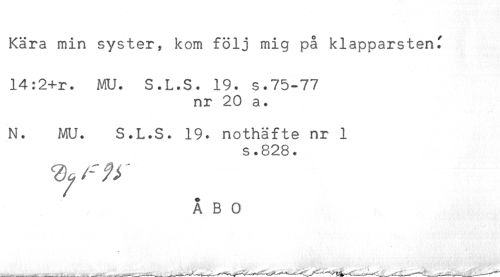 //// Kära min syster, kom följ mig på klapparstenf //// 14:2+r. MU. S.L.S. 19. s.75-77 //// nr 20 a. //// N. MU. S.L.S. 19. nothäfte nr 1 //// s.828. //// ÅBO ////