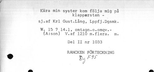 //// . //// Kära min syster kom följa mig på //// klappersten - //// sj.af Krl Gust.Lång, Lppfj.Dgsmk. //// . //// W. 15 ? 14.1, omtagn.o.omqv.- //// (A:son) V.af 1210 m.flera. m. //// Del II nr 1033 //// . //// RANCKEN FÖRTECKNING //// * a ////