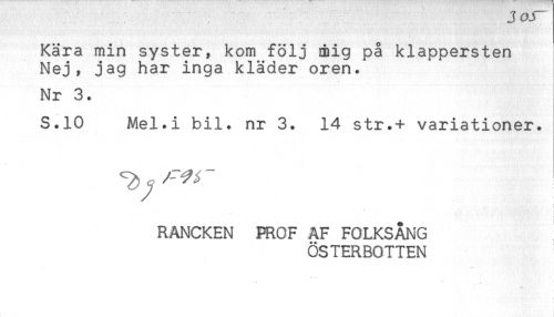 //// Kära min syster, kom följ mig på klappersten //// Nej, jag har inga kläder oren. //// Nr 3. //// S.10 Mel.i bil. nr 3. 14 str.+ variationer. //// RANCKEN PROF AF FOLKSÅNG //// ÖSTERBOTTEN ////