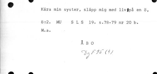 //// Kära min syster, släpp mig med livgpå en ö, //// 8:2. MU S L S 19. s.78-79 nr 20 b. //// M. a. //// ÅBO ////