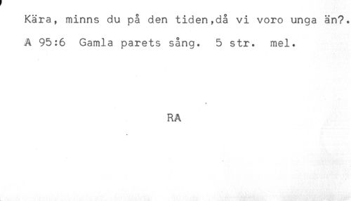 //// Kära, minns du på den tiden,då vi voro unga än?. //// A 95:6 Gamla parets sång. 5 str. mel. //// * //// RA //// t ////