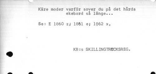 //// Käre moder varför sover du på det hårda //// ekebord så länge... //// Se: E 1860 z; 1861 e; 1862 x, //// t //// t //// ^ KB:s SKILLINGIRSCKSREG. ////