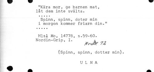 //// "Kära mor, ge barnen mat, //// låt dem inte svälta. //// ***** //// Spinn, spinn, doter min //// i morgon kommer friarn din." //// ***** //// Hlsl Mo, 14778, s.59-60. //// Nsrdin-Grip, I. ^ ^ //// (Spinn, spinn, dotter min). //// U L M Ä ////