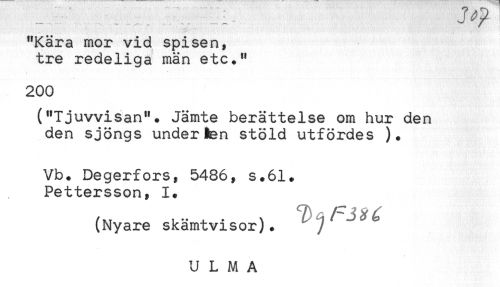 //// - . . .. . .. . . J v //// "Kära mor vid spisen, //// tre redeliga män etc." //// 200 //// ("ljuvvisan". Jämte berättelse om hur den //// den sjöngs under<en stöld utfördes ). //// Vb. Degerfors, 5486, s.61. //// Pettersson, //// (Nyare skämtvisor). ^ /^ '^ //// U L M A ////