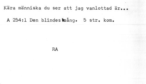 //// Kära människa du ser att jag vanlottad är... //// A 254:1 Den blindestaång. 5 str. kom. //// RA ////