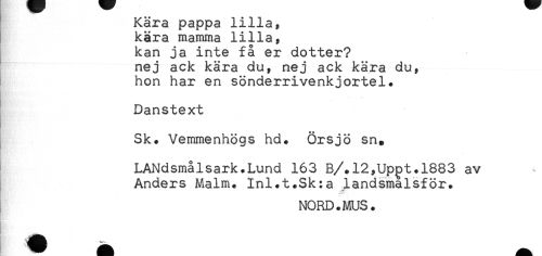 //// Kära pappa lilla, //// kära mamma lilla, //// kan ja inte få er dotter? //// nej ack kära du, nej ack kära du, //// hon har en sönderrivenkjortel. //// Danstext //// Sk. Vemmenhögs hd. Örsjö sn. //// * //// LANdsmålsark.Lund 163 B/.12,Uppt.l883 av //// Anders Malm. Inl.t.Sk:a landsmalsför. //// ..V ' //// NORD.MUS. ////