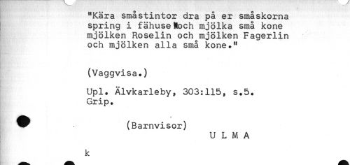 //// "Kära småstintor dra på er småskorna //// spring i fähuseMoch mjölka små kone //// mjölken Roselin och mjölken Fagerlin //// och mjölken alla små kone." //// (Vaggvisa.) //// Upl. Älvkarleby, 303:115, s.5. //// Grip. //// ^^ (Barnvisor) //// U L M A //// k ////