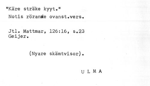 //// "Käre sträke kyyt." //// Notis rörande ovanst+vers. //// Jtl. Mattmar, 126:16, s.23 //// Geijer. //// (Nyare skämtvisor). //// U L M A ////