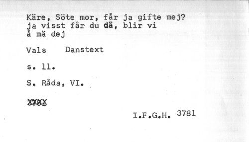 //// Käre, Söte mor, får ja gifte mej? //// ja visst får du dä, blir vi //// <3 *+ 1 * //// a ma dej //// Vals Danstext //// s* 11. //// S. Råda, VI. //// xxax //// I.F.G.H. 3781 ////