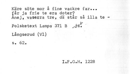 //// Käre söte mor å fine vackre far... //// får ja frie te era doter? //// Ånej, vaserra tre, dä står så illa te - //// Polsketext Lampa 371 B ^yåf //// Långserud (Vi) //// s. 62. //// I.F.G.H. 1228 ////