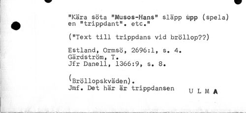 //// t //// i //// "Kära söta "Musos-Hans" släpp upp (spela) //// ^ en "trippdant". etc." //// ("Text till trippdans vid bröllop??) //// Estland, Ormsö, 2696:1, s. 4. //// Gärdström, T. //// Jfr Danell, 1366:9, s. 8. //// ^Bröllopskväden). //// Jmf. Det här är trippdansen U L M A ////