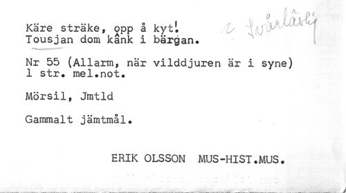 //// Käre sträke, opp å kytL . ^ ^J ^f //// Tousjan dom kånk i bärgan* ^ [ //// Nr 55 (Allarm, när vilddjuren är i syne) //// 1 str. mel.not. //// Mörsil, Jmtld //// Gammalt jämtmål. //// ERIK OLSSON MUS-HIST.MUS. //// * s *** * ' . //// — —. ? * * //// . ! ////