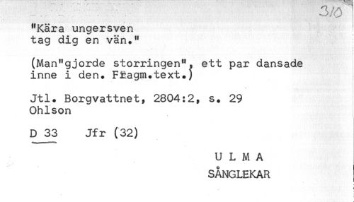 //// < '..... . //// "Kära ungersven //// tag dig en vän." //// (Man"gjorde storringen", ett par dansade //// inne i den. FRagm.text.) //// Jtl. Borgvattnet, 2804:2, s. 29 //// Ohlson //// D 33 Jfr (32) //// U L M A //// SÅNGLEKAR ////