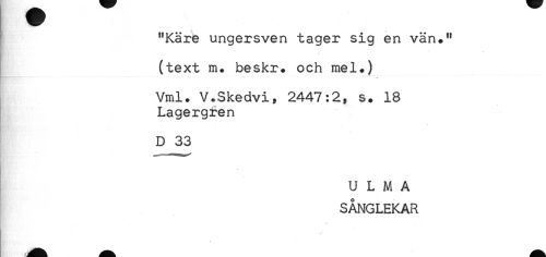 //// "Käre ungersven tager sig en vän." //// (text m. beskr* och mel.) //// r..... //// Vml. V+Skedvi, 2447:2, s. 18 //// Lagergren //// D 33 //// * //// U L M A //// SÅNGLEKAR ////