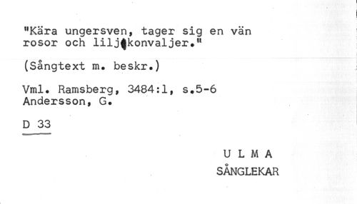 //// "Kära ungersven, tager sig en vän //// rosor och liljekonvaljer." //// (Sångtext m. beskr.) //// Vml. Ramsberg, 3484:1, s.5-6 //// Andersson, G. //// D 33 //// U L M A //// SÅNGLEKAR ////