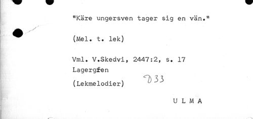 //// "Käre ungersven tager sig en vän." //// ! //// K //// /^ (Mel. t. lek) //// Vml. V.Skedvi, 2447:2, s. 17 //// Lagergfen //// (Lekmelodier) ^^^ //// U L M A //// ^---- ////