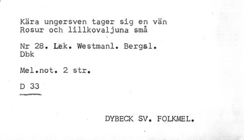 //// Kära ungersven tager sig en vän //// Rosur och lillkovaljuna små //// Nr 28. Lek. Westmani. Bergsl. //// Dbk //// Mel.not. 2 str. //// D 33 //// DYBECK SV. FOLKMEL. ////