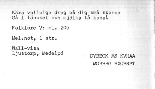 //// Kära vallpiga drag på dig små skorna //// Gå i fähuset och mjölka tå konat //// Folklore V: bl. 205 //// Mel.not, 1 str. //// Wall-visa //// Ljustorp, Medelpd ^^ ^ ^^ //// MOBERG EXCERPT ////