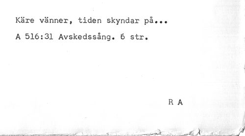 //// Käre vänner, tiden skyndar på... //// A 516:31 Avskedssång. 6 str. //// R A ////