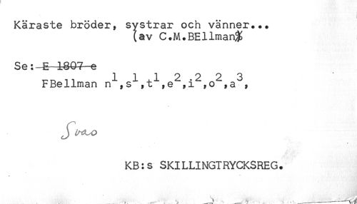 //// Käraste bröder, systrar och vänner... //// (av C.M.BEllman% //// Se:-& 1807 c //// Trii n 1 1 ,1 2 ,2 2 3 //// FBellman n ,s , t ,e , o , a , //// * //// KB:s SKILLINGTRYCKSREG. //// '.. ^ ) __'' <-___-—-—--% ////