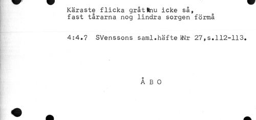 //// Käraste flicka gråtMnu icke så, //// fast tårarna nog lindra sorgen förmå //// 4:4.? SVenssons saml.häfte iNr 27,s.112-113. //// ÅBO //// ' ////