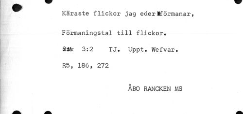 //// Käraste flickor jag ederKförmanar, //// - //// - //// Förmaningstal till flickor. //// 2M< 3:2 TJ. Uppt. Wefvar. //// R5, 186, 272 //// ÅBO RANCKEN MS ////