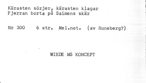 //// Kärasten sörjer, kärasten klagar //// Fjerran borta på Saimens skär //// Nr 300 6 str. Mel.not. (av Runeberg?) //// * //// WIEDE MS KONCEPT //// k ////
