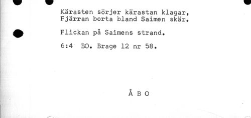 //// Kärasten sörjer kärastan klagar, //// Fjärran borta bland Saimen skär. //// ^^ Flickan på Saimens strand. //// - //// 6:4 BO. Brage 12 nr 58. //// O //// A B O //// * //// ....." .. ////