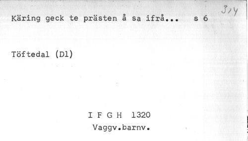 //// j/y //// Käring geck te prästen å sa ifrå... s 6 //// i //// r //// ! //// Töftedal (Dl) //// ; //// i //// I F G H 1320 , //// L //// Vaggv.barnv. ! //// H //// : //// f ////