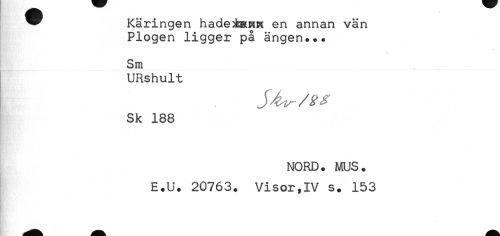 //// ^ Käringen hade±KKK en annan vän //// Plogen ligger på ängen... //// Sm //// URshult //// Sk 188 //// NORD. MUS. //// E.U. 20763. Visor,IV s. 153 ////