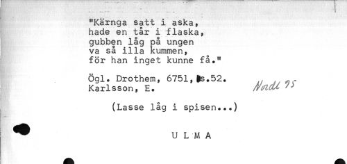 //// * //// ...... //// "Kärnga satt i aska, //// hade en tår i flaska, //// gubben låg på ungen //// va så illa kummen, //// för han inget kunne få." //// Ögl. Drothem, 6751, !s.52. //// Karlsson, E. ^ //// (Lasse låg i spisen...) //// ^ U L M A //// 1! H ^ ////
