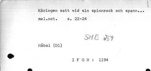 //// Käringen satt vid sin spinnrock och spann... //// mel.not. s. 22-24 //// I .R? //// Håbol (Dl) //// I F G H : 1194 //// //// /
